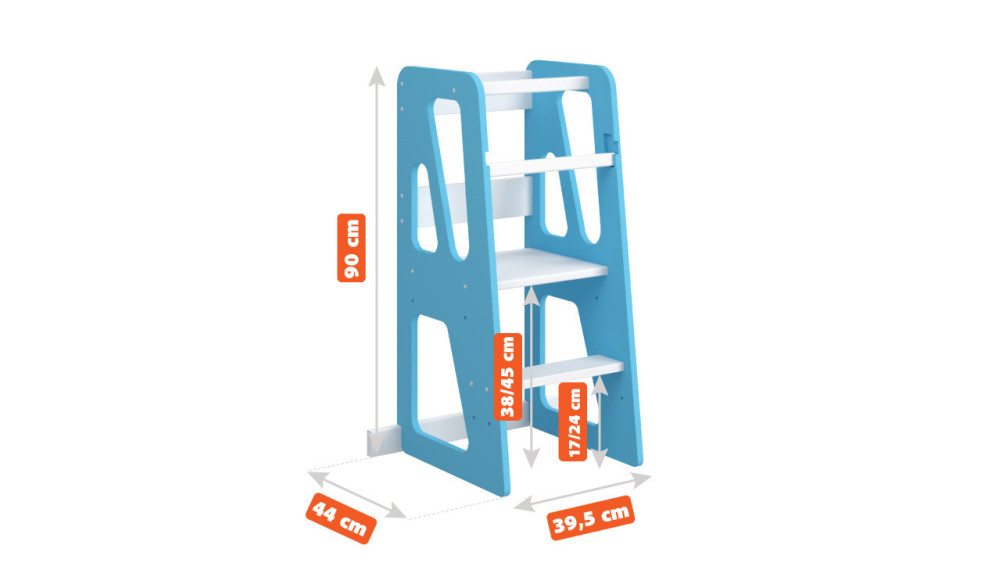Model Trójkąty wyróżnia się regulacją wysokości podestu na poziomach: 38 cm i 45 cm, a stopnie można ustawić na wysokości 17 cm lub 24 cm. Pozwala to na idealne dopasowanie mebla do wzrostu rosnącego dziecka. Całkowite wymiary to 90x44x39,5 cm, co sprawia, że jest to idealny pomocnik kuchenny z regulacją wysokości do każdej kuchni.