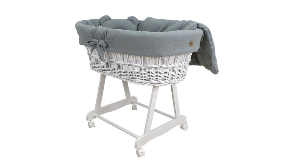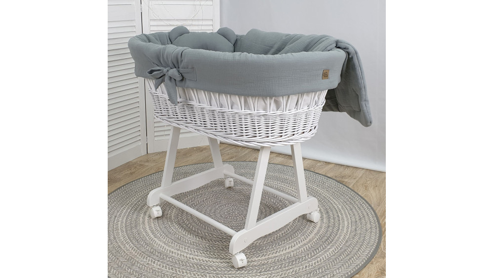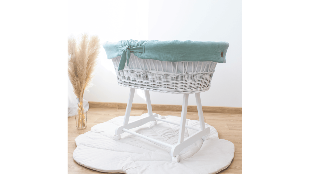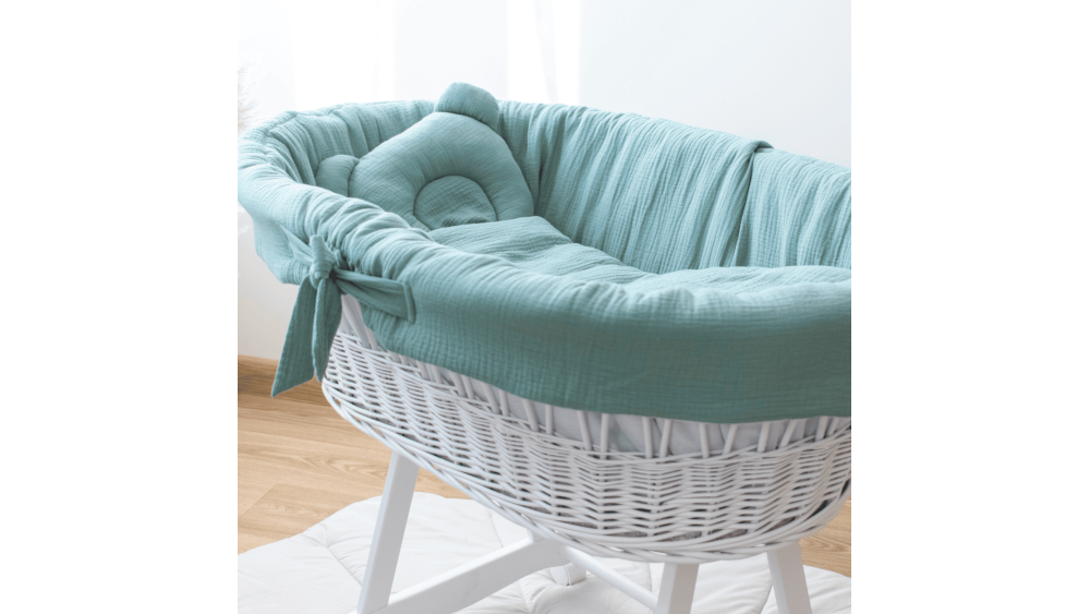 Dostępność wariantów kolorystycznych obejmuje białe, szare i naturalne kosze oraz szeroką gamę muślinowej pościeli: od klasycznej bieli i beżu, po delikatny róż i zieleń. Dzięki temu bez trudu dopasujesz zestaw do stylu wnętrza lub innych mebli dziecięcych.