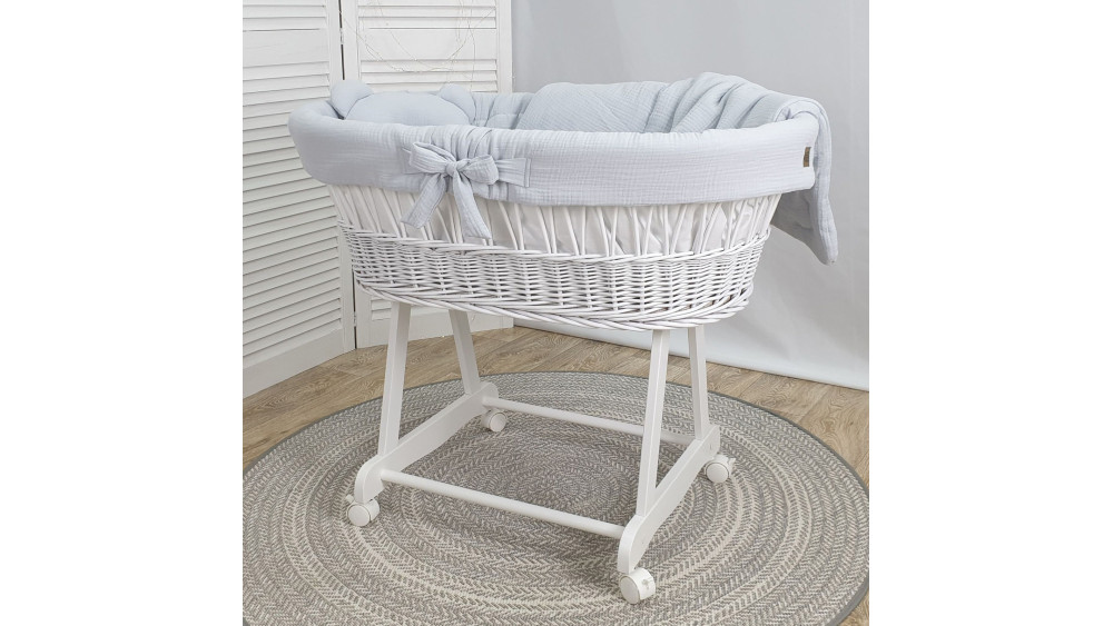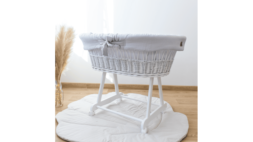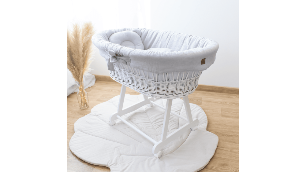 Dostępność wariantów kolorystycznych obejmuje białe, szare i naturalne kosze oraz szeroką gamę muślinowej pościeli: od klasycznej bieli i beżu, po delikatny róż i zieleń. Dzięki temu bez trudu dopasujesz zestaw do stylu wnętrza lub innych mebli dziecięcych.