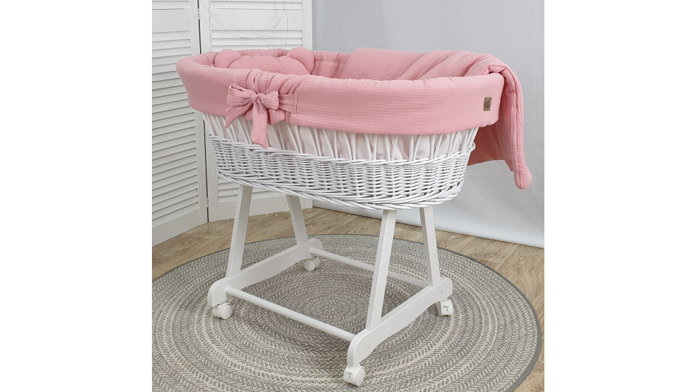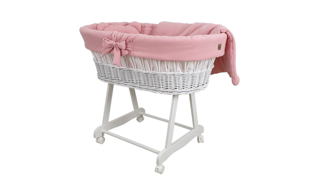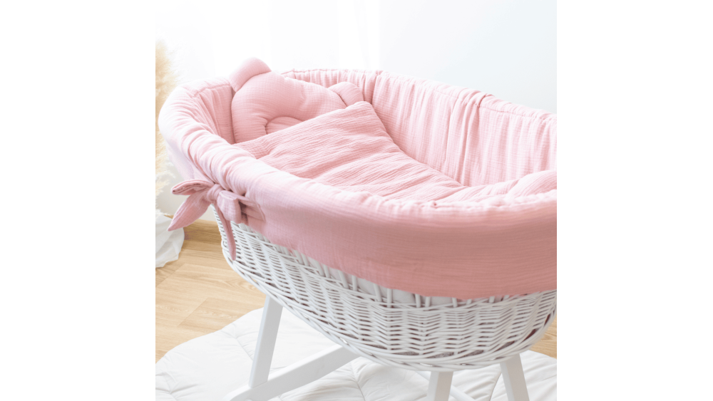Dostępność wariantów kolorystycznych obejmuje białe, szare i naturalne kosze oraz szeroką gamę muślinowej pościeli: od klasycznej bieli i beżu, po delikatny róż i zieleń. Dzięki temu bez trudu dopasujesz zestaw do stylu wnętrza lub innych mebli dziecięcych.