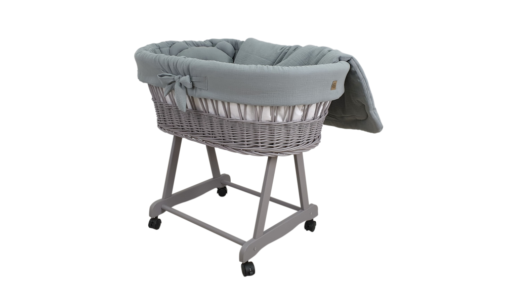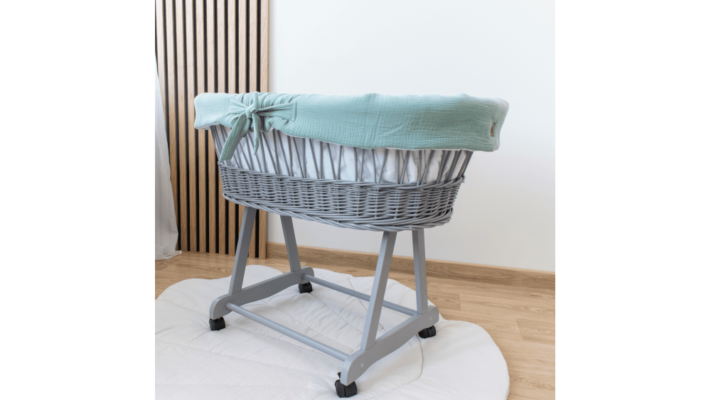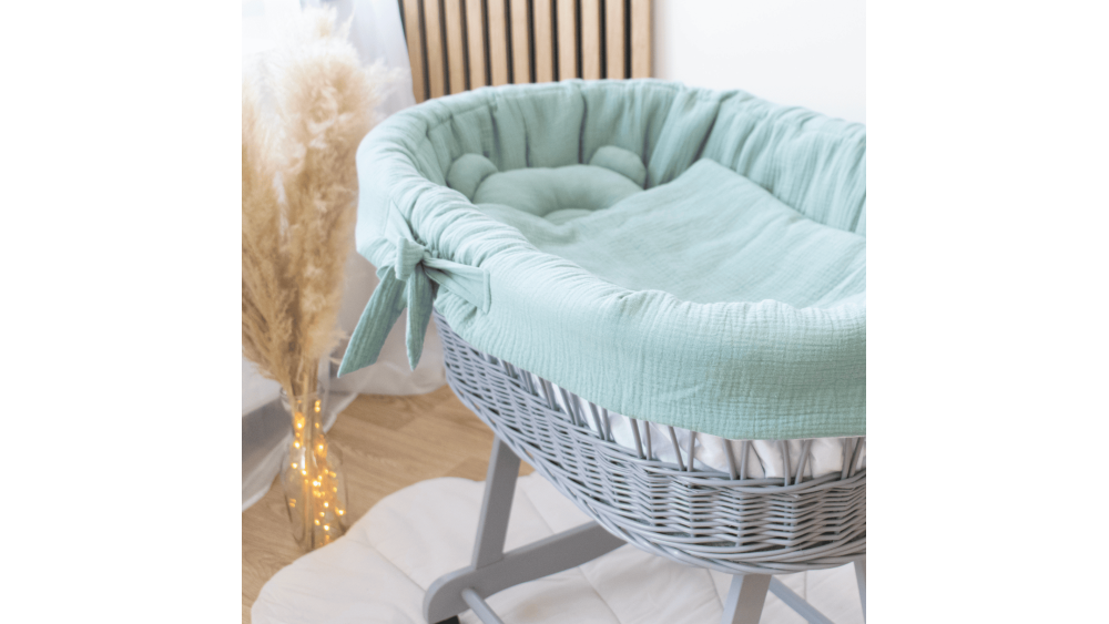 Dostępność wariantów kolorystycznych obejmuje białe, szare i naturalne kosze oraz szeroką gamę muślinowej pościeli: od klasycznej bieli i beżu, po delikatny róż i zieleń. Dzięki temu bez trudu dopasujesz zestaw do stylu wnętrza lub innych mebli dziecięcych.