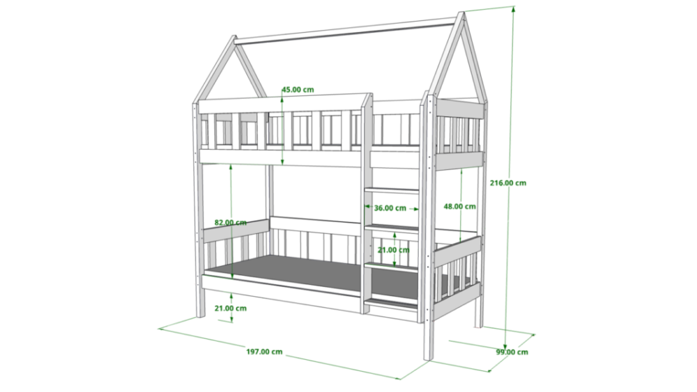 Dzięki unikalnemu designowi w formie domku, mebel staje się ulubionym miejscem kreatywnej aktywności dzieci. Model wyposażono w ergonomiczną drabinkę, barierki ochronne oraz dwa solidne stelaże. Produkt dostępny jest w 6 optymalnych rozmiarach oraz ponadczasowych wersjach kolorystycznych, z możliwością dokupienia funkcjonalnej szuflady na pościel lub dodatkowe spanie.