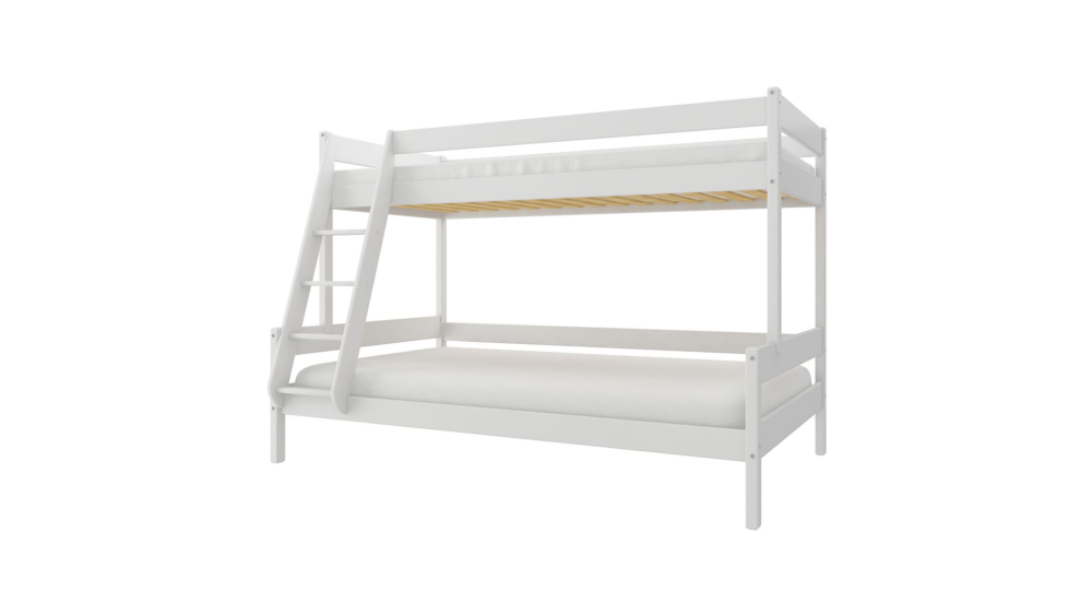 FAMILIJNE to funkcjonalne łóżko piętrowe, zaprojektowane z myślą o rodzinach z trójką dzieci lub rodzeństwem w różnym wieku. Całość wykonana została z naturalnego drewna sosnowego, co gwarantuje nie tylko trwałość i stabilność, ale także ponadczasową estetykę mebla. Ten model wyróżnia się unikalną konstrukcją z szerszym dolnym łóżkiem – idealnym do wspólnego snu młodszego rodzeństwa lub jako przestronna strefa do zabawy i odpoczynku w ciągu dnia. Górne łóżko o standardowych wymiarach przeznaczone jest dla starszego dziecka, które potrzebuje własnej, komfortowej strefy snu.