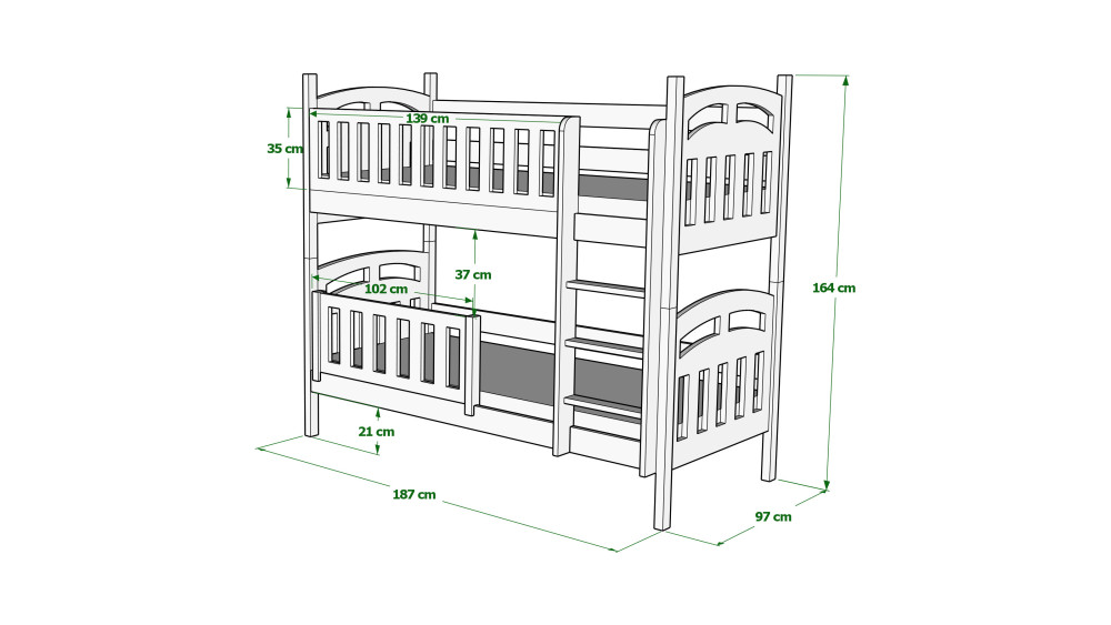 Łóżko ZUZIA PIĘTROWA jest dostępne w szerokiej palecie wymiarów, co pozwala na idealne dopasowanie modelu do metrażu pokoju. Oferujemy następujące rozmiary: