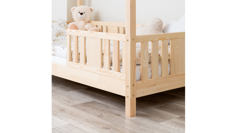 Drewniane łóżko pojedyncze z daszkiem NIKO SHORT 10 łączy praktyczność z dziecięcą radością. Podniesiona rama ułatwia codzienne użytkowanie, a naturalny charakter drewna wprowadza do pokoju harmonię i spokój.