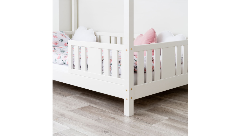 To łóżko dziecięce z daszkiem, które pobudza wyobraźnię i zamienia codzienny sen w przygodę. Drewniany daszek w wersji SHORT tworzy wyjątkowo przytulny klimat — można ozdobić go światełkami, girlandami lub tkaniną, tworząc bajkową przestrzeń do zabawy, czytania i odpoczynku.