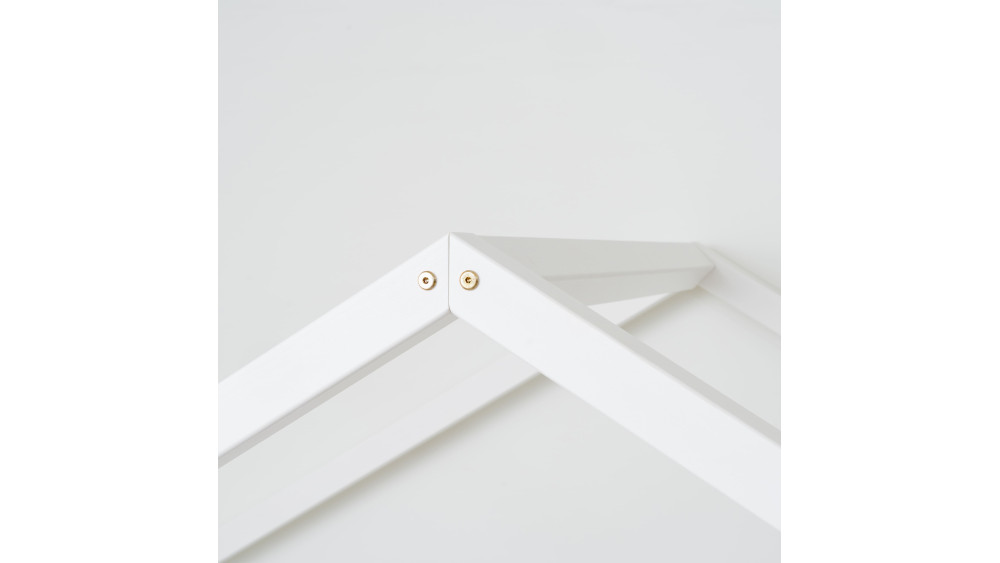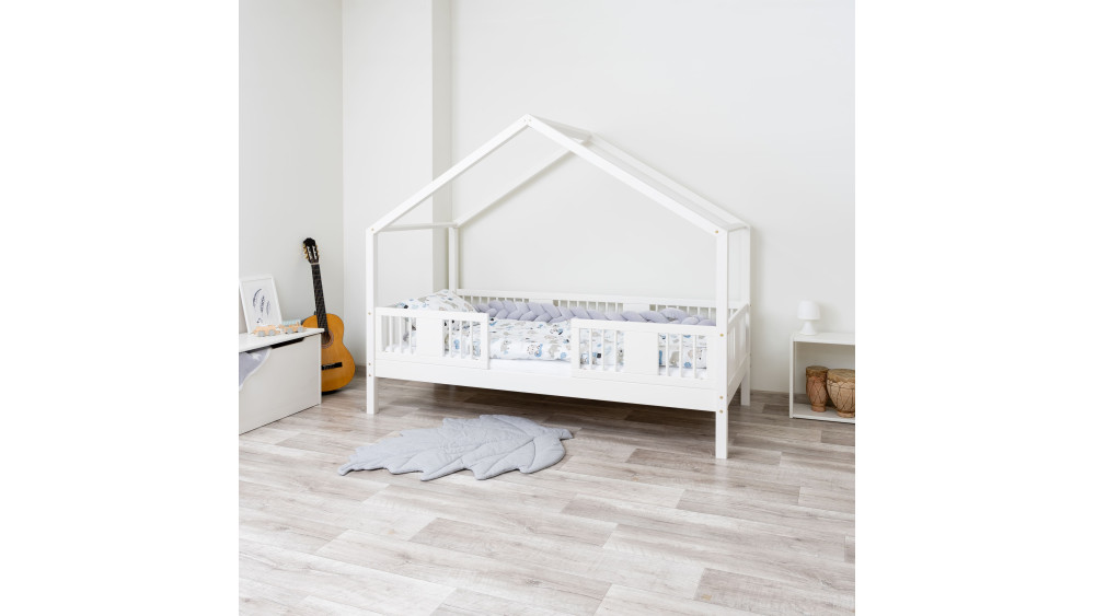 Konstrukcja domku pobudza kreatywność – w dzień łóżko zamienia się w bazę do zabawy, a wieczorem sprzyja wyciszeniu. Wystarczy dodać miękką bawełnianą pościel i delikatne oświetlenie, by stworzyć przytulną atmosferę snu.