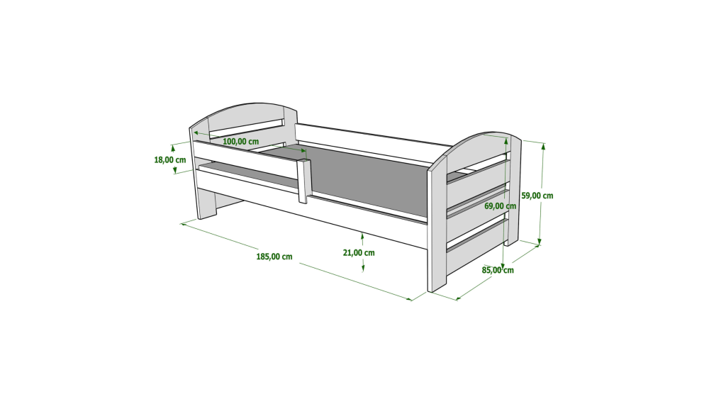 • System barier ochronnych – łóżko wyposażone jest w barierki: pełną oraz krótką (100 cm), które zabezpieczają dziecko przed wypadnięciem podczas snu.