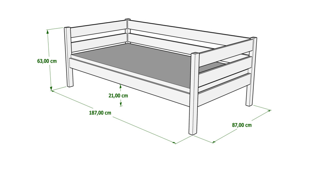 Charakterystyczną cechą tego modelu jest wysoki zagłówek wykonany z poziomych deseczek oraz brak bocznych barierek, co czyni łóżko wielofunkcyjnym. Może ono służyć jako klasyczne łóżko lub jako wygodna sofa do czytania i relaksu. To idealne rozwiązanie do niewielkich przestrzeni, świetnie uzupełniające naszą ofertę łóżek pojedynczych.