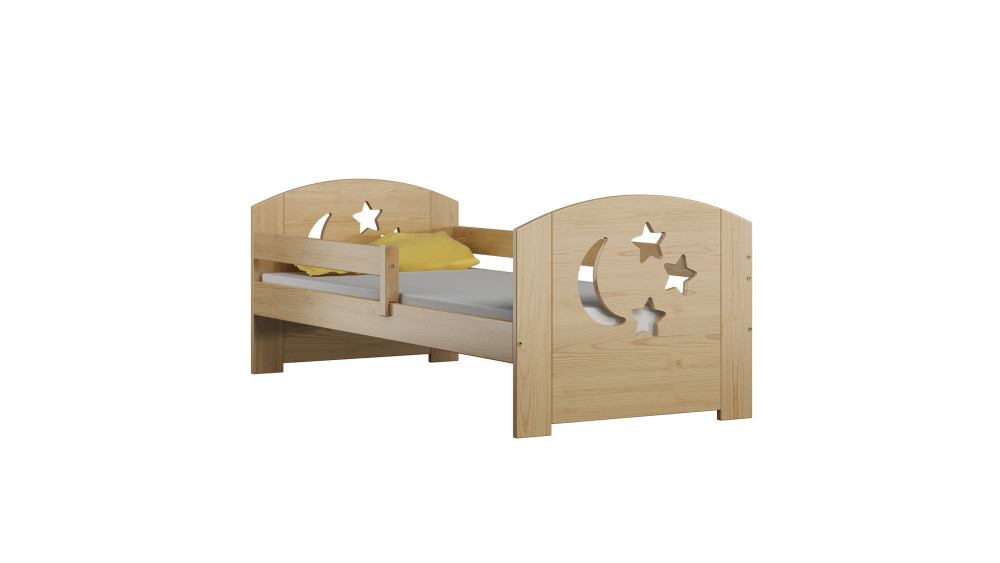 Łóżko dziecięce MOLI wykonane z naturalnego drewna sosnowego to idealne rozwiązanie do pokoju malucha. Dekoracyjne wycięcia w kształcie księżyca i gwiazdek nadają wnętrzu niepowtarzalny, bajkowy klimat, sprzyjający wyciszeniu przed snem.