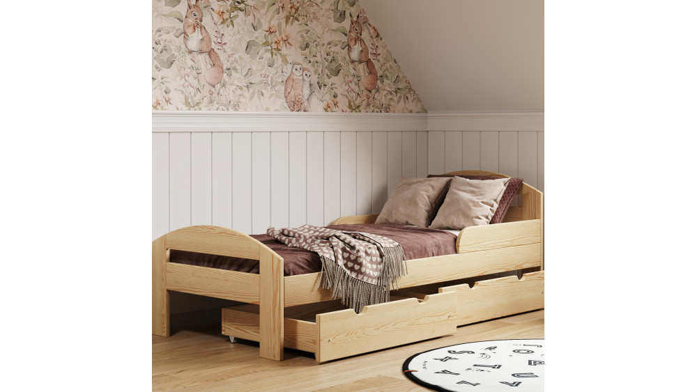 Drewniane łóżko TIMI zostało stworzone z myślą o dzieciach od około 3. roku życia. Jego nisko osadzona rama umożliwia maluchowi samodzielne korzystanie z łóżka bez ryzyka upadku. Dodatkowo, zaokrąglone krawędzie oraz barierki przy zagłówkach zwiększają poziom bezpieczeństwa i ograniczają zsuwanie się poduszek podczas snu. Wszystko to bez rezygnacji z estetyki.
