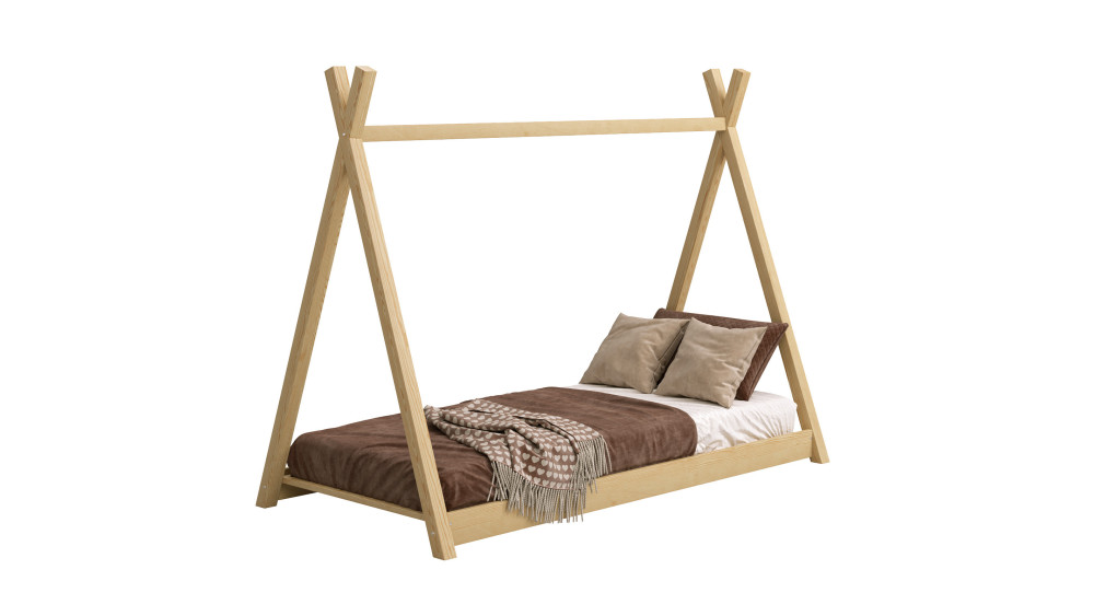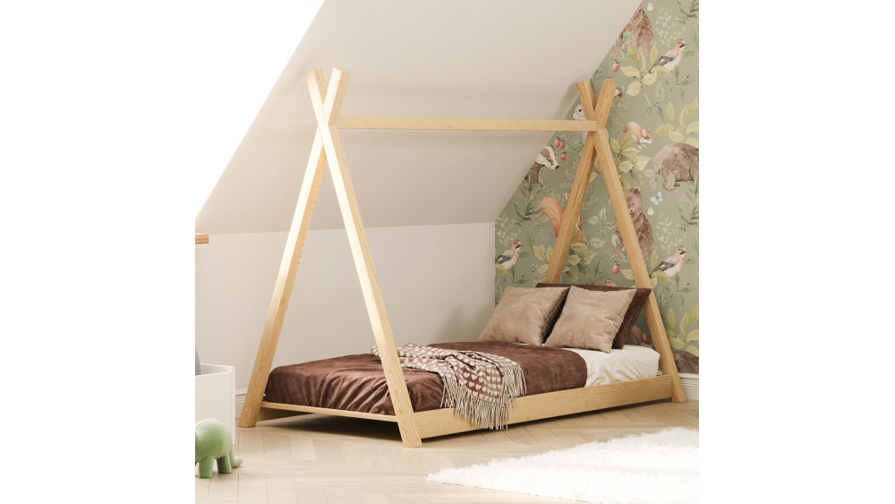 Łóżko dziecięce TIPI to drewniane łóżko wykonane z naturalnej sosny w formie namiotu tipi, wyposażone w niską ramę i zaokrąglone krawędzie, co czyni je bezpiecznym rozwiązaniem już od 2–3 roku życia. Solidna konstrukcja posiada drewniany stelaż w zestawie, a całość została zabezpieczona ekologicznymi lakierami wodnymi zgodnymi z normą EN 71-3.