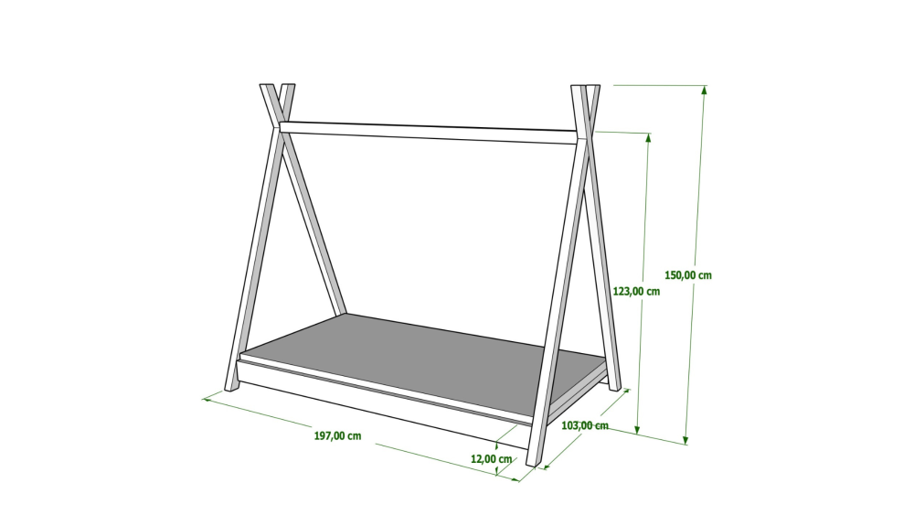 Łóżko dziecięce TIPI to drewniane łóżko wykonane z naturalnej sosny w formie namiotu tipi, wyposażone w niską ramę i zaokrąglone krawędzie, co czyni je bezpiecznym rozwiązaniem już od 2–3 roku życia. Solidna konstrukcja posiada drewniany stelaż w zestawie, a całość została zabezpieczona ekologicznymi lakierami wodnymi zgodnymi z normą EN 71-3.