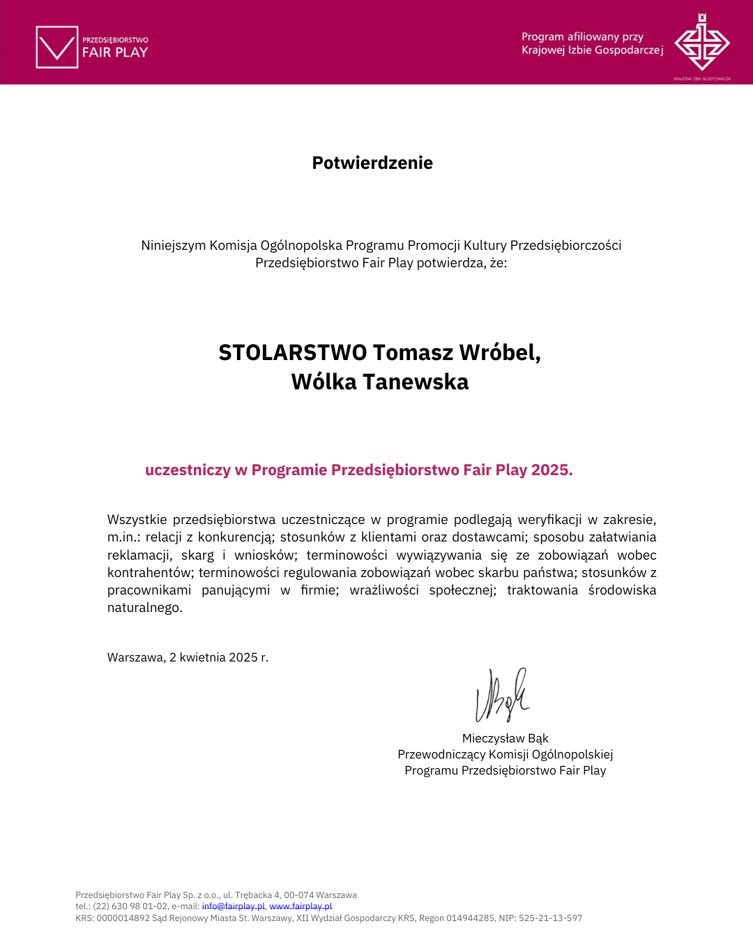 - Certyfikat "Przedsiębiorstwo Fair Play" przyznawany przez Krajową Izbę Gospodarczą (od 2018 r.)
