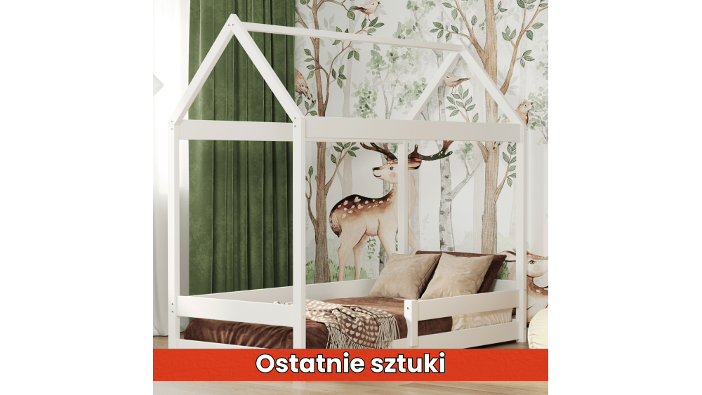Chcesz stworzyć swojemu dziecku wyjątkowe miejsce, które będzie nie tylko bezpiecznym łóżkiem, ale też inspirującą strefą zabawy? Łóżko DOMEK MIŚ to rozwiązanie, które łączy w sobie prostą formę z dziecięcą wyobraźnią. Drewniana konstrukcja przypominająca domek pozwala zamienić pokój w leśną chatkę, tajemniczy namiot lub przytulny azyl. Minimalna wysokość materaca gwarantuje pełne bezpieczeństwo użytkowania – również dla najmłodszych dzieci.