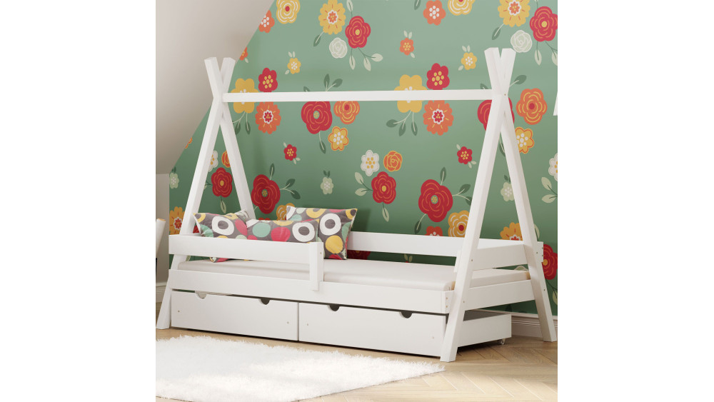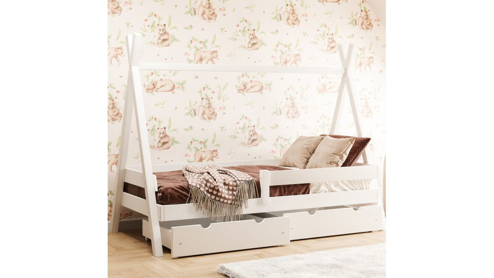 TIPI PLUS to łóżko stworzone z myślą o dzieciach od około 3. roku życia. Solidna rama wykonana z naturalnego drewna sosnowego oraz estetyczne wykończenie sprawiają, że jest to wybór spełniający oczekiwania najbardziej wymagających rodziców. Niska konstrukcja sprzyja samodzielności dziecka, a unikalny kształt pozwala na tworzenie bajkowych dekoracji w domowym zaciszu.